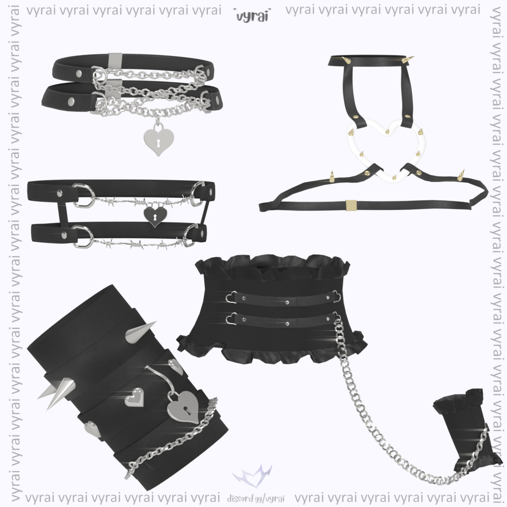 Tris: Choker: 14k, Harness: 13k, Bracelet Cuff: 11k, Garter: 20k, Corset: 21k